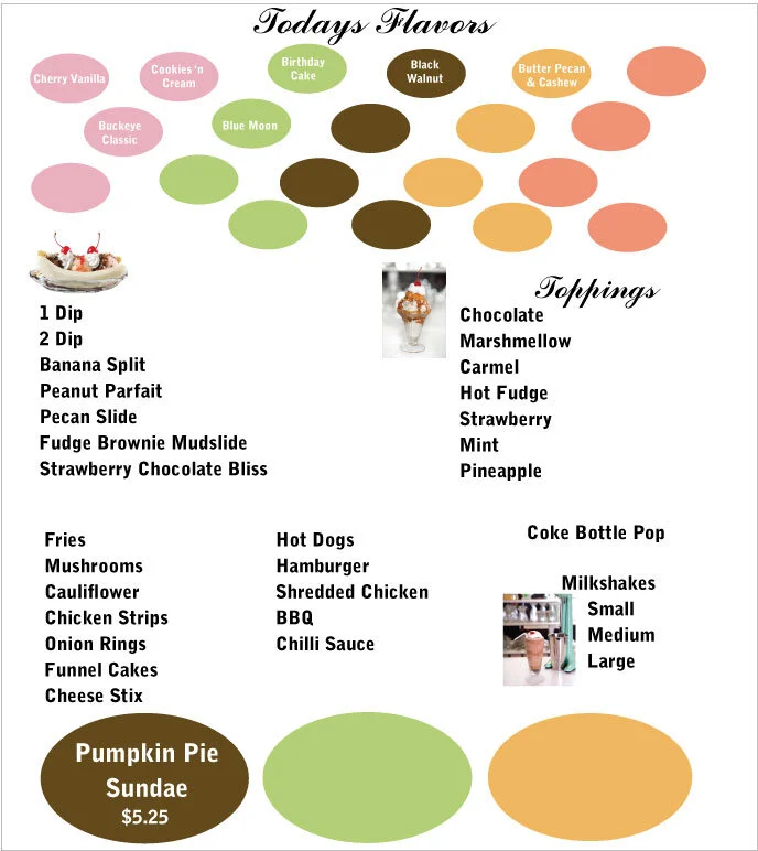 Everything comes together in InDesign. It’s where you bring in your Photoshop and Illustrator work and where you can create Brochures, Posters, Newsletters, Business Cards, etc… Below you will see a project that I worked on for a client, Debbie’s Ice Cream, who wanted me to redesign their menu. You can also see what the finished menu looks like displayed in their shop.