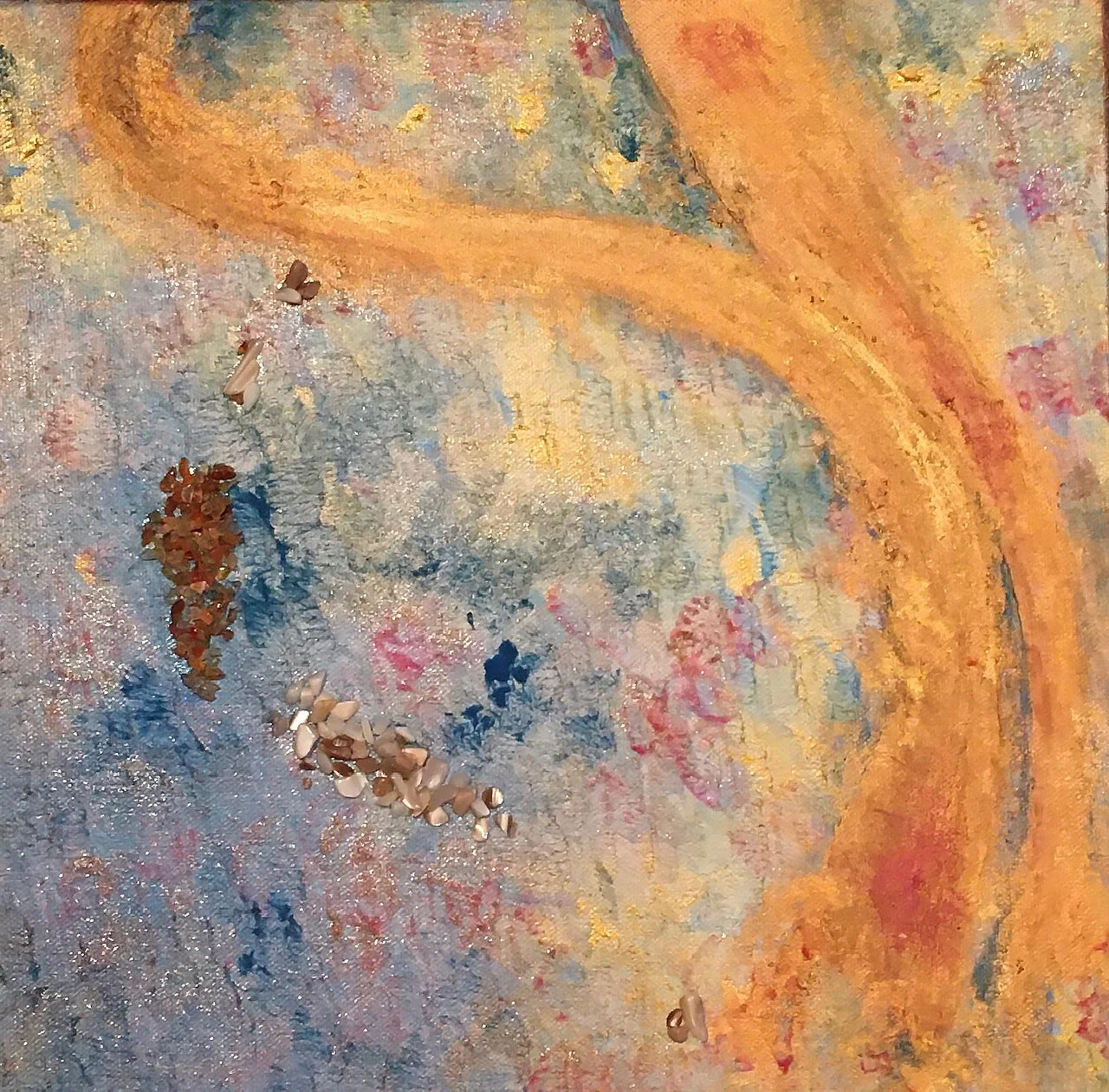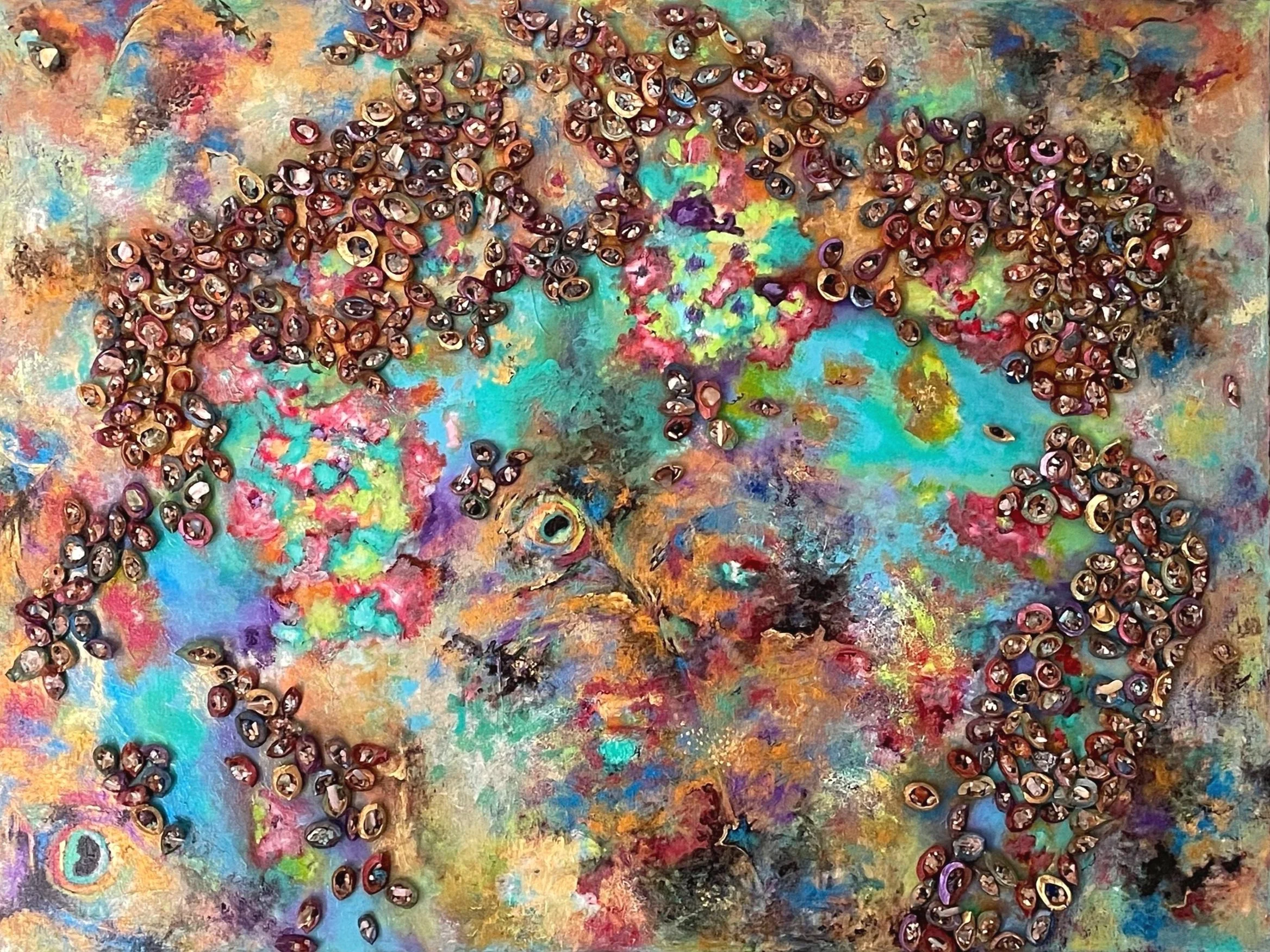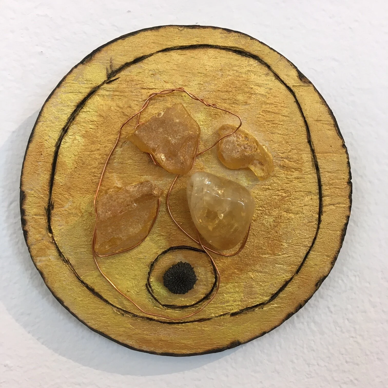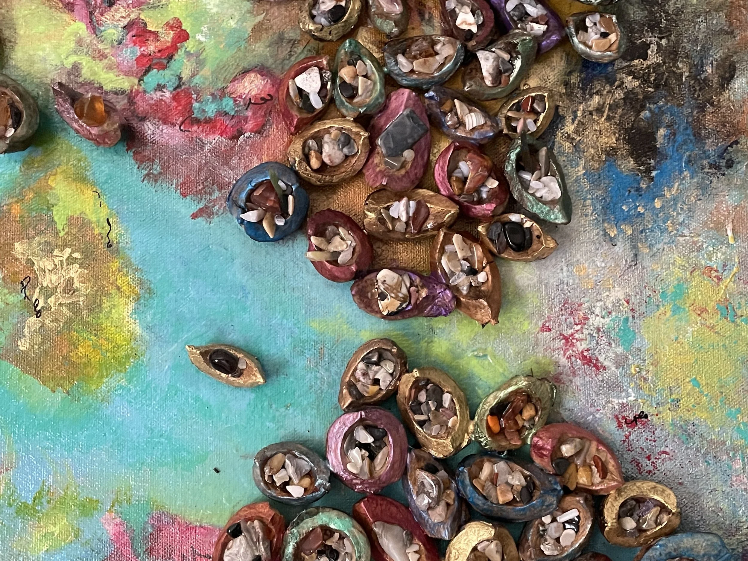 Walnut shells collected in the nearby forest, painted and filled with crystals, blended into my painting.