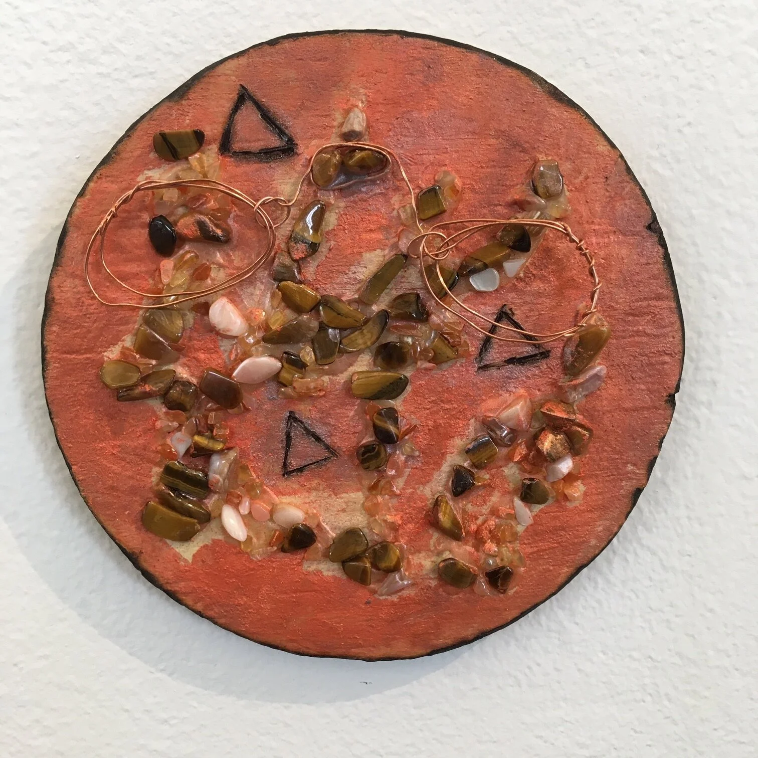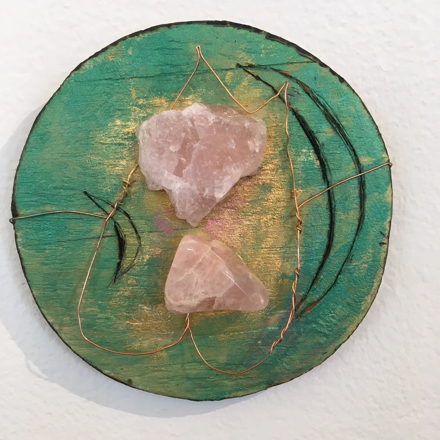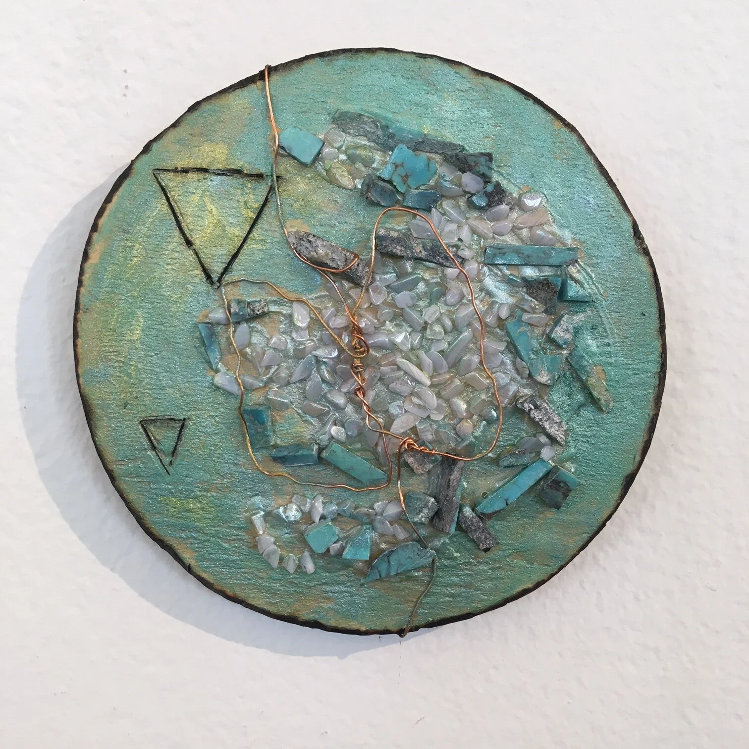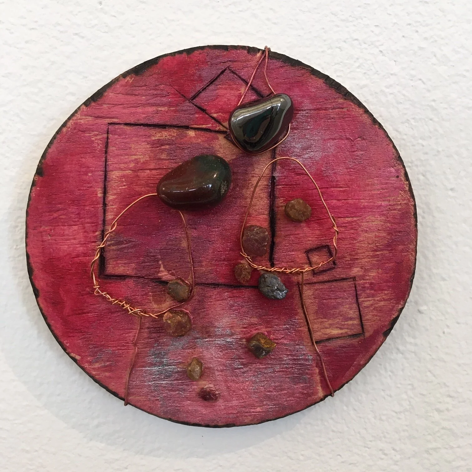 Walnut shells collected in the nearby forest, painted and filled with crystals, blended into my painting.